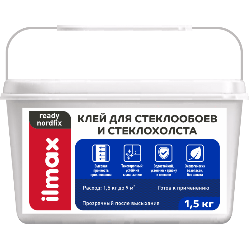 ilmax ready nordfiх – устойчивый к грибку и плесени клей на основе дисперсии акрилового сополимера, тиксотропный, удобный в работе. Прозрачный после высыхания клей не желтеет со временем. Не содержит ПВА и растворителей. Устойчивый к намоканию при дальнейшем проведении отделочных работ.